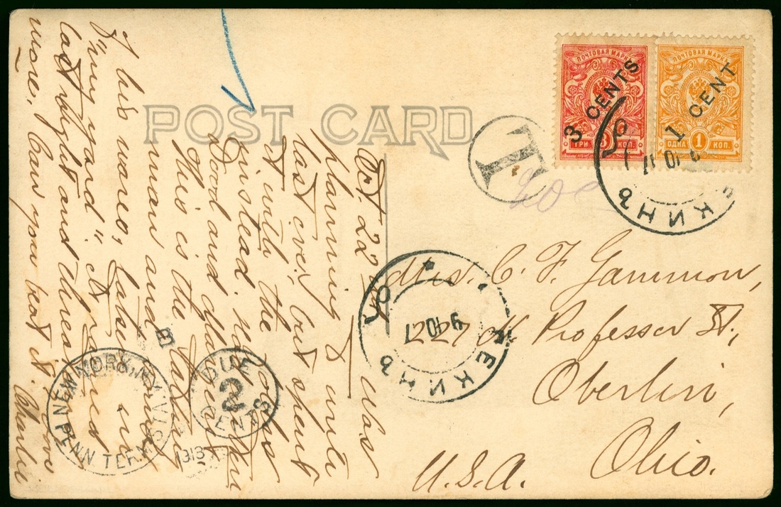 1917 (9 Oct.) a picture postcard to USA bearing 1c. on 1k. and 3c. on 3k. tied by Peking c.d.s. circle “T” marking alongside. Due 2c. charged