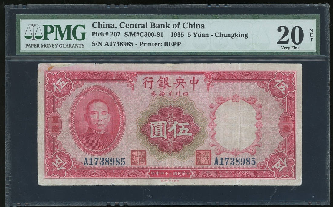 Central Bank of China, 5 Yuan, Chungking, 1935, serial number A1738985, (Pick 207), PMG 20NET, Very Fine, repaired, rust, annotation. A scarcer type