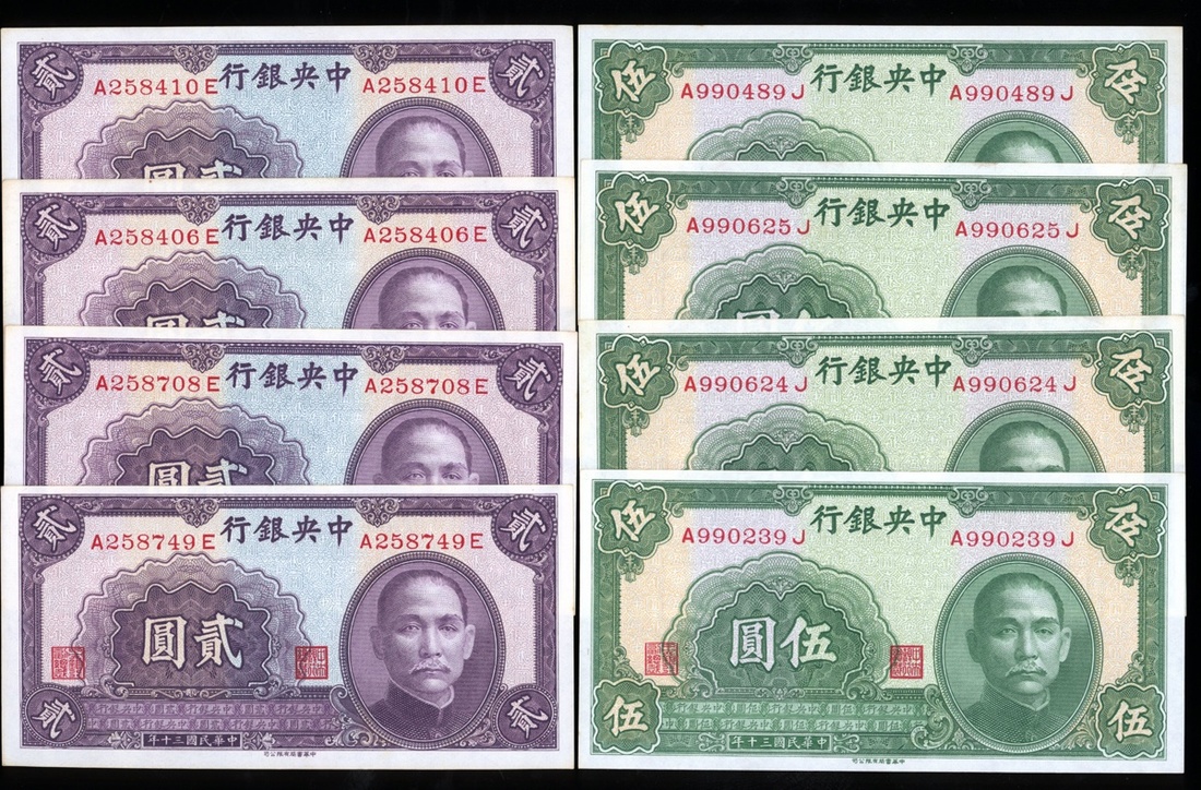 民國三十年中央銀行貳圓(2),伍圓(4)一組六枚,有黃,均AU-UNC