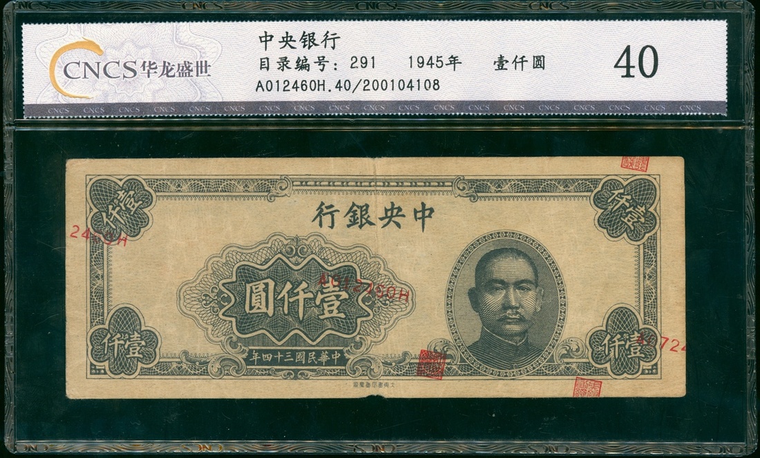 1945年中央銀行1000元,編號A012460H,編號及紅印移位錯體,CNCS 40
