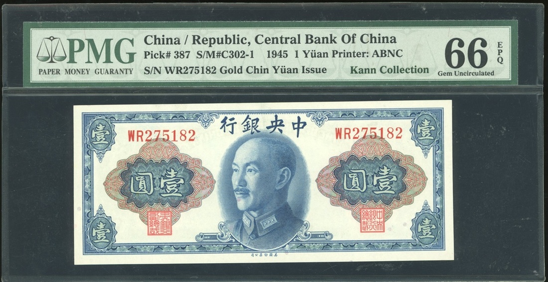 Central Bank of China, 1 Yuan, 1945, serial number WR275182, (Pick 387), PMG 66EPQ, Gem Uncirculated, ex-Kann Collection,