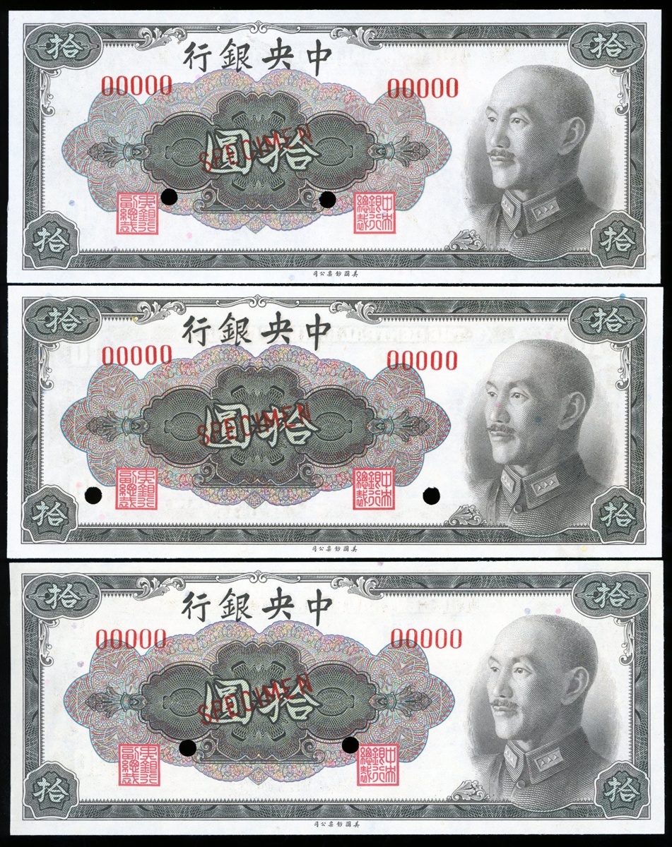 民國三十四年中央銀行拾圓樣票一組三枚,均AU-UNC