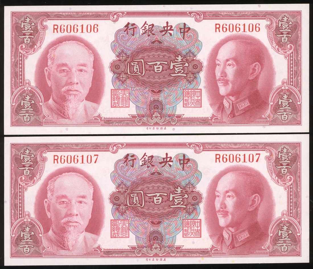 Central Bank of China, 100 Yuan, 1945, serial numbers R606106-R606107, (Pick 394), uncirculated (2)