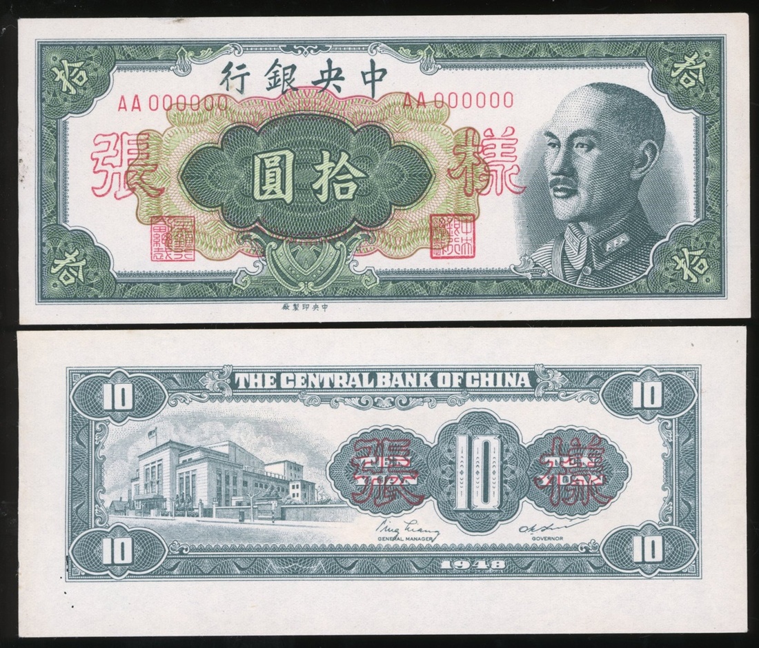 Central Bank of China, 10 Yuan, obverse and reverse specimens, 1948, serial number AA000000, (Pick 399s), about uncirculated to uncirculated (1 pair)