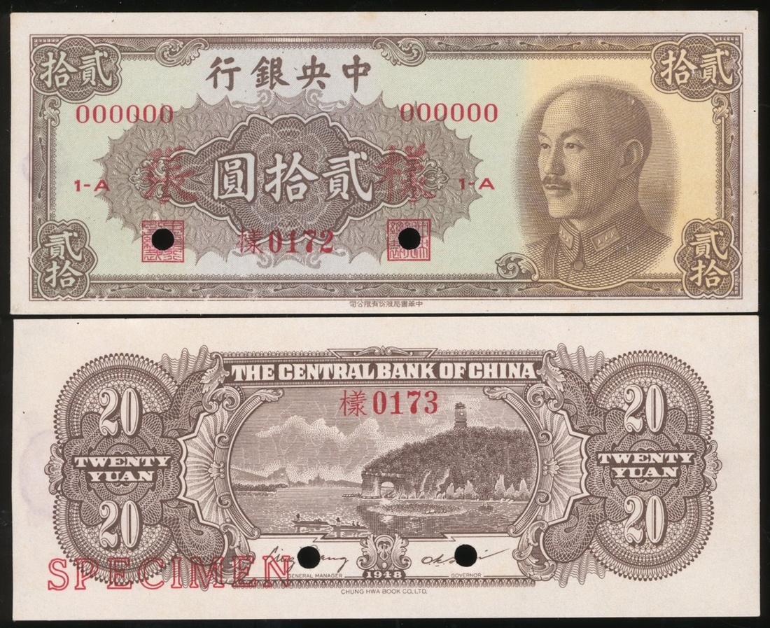 Central Bank of China, 20 Yuan, obverse and reverse specimens, 1948, serial number 1-A 000000, (Pick 400s), about uncirculated to uncirculated (1 pair)