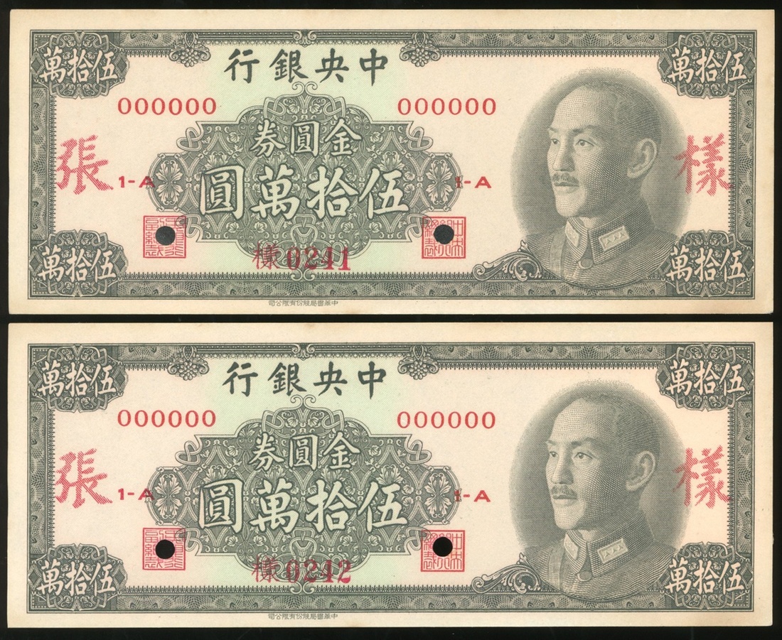 中央銀行金圓券50000元正面樣鈔2枚一組,中華書局印製,AU至UNC品相