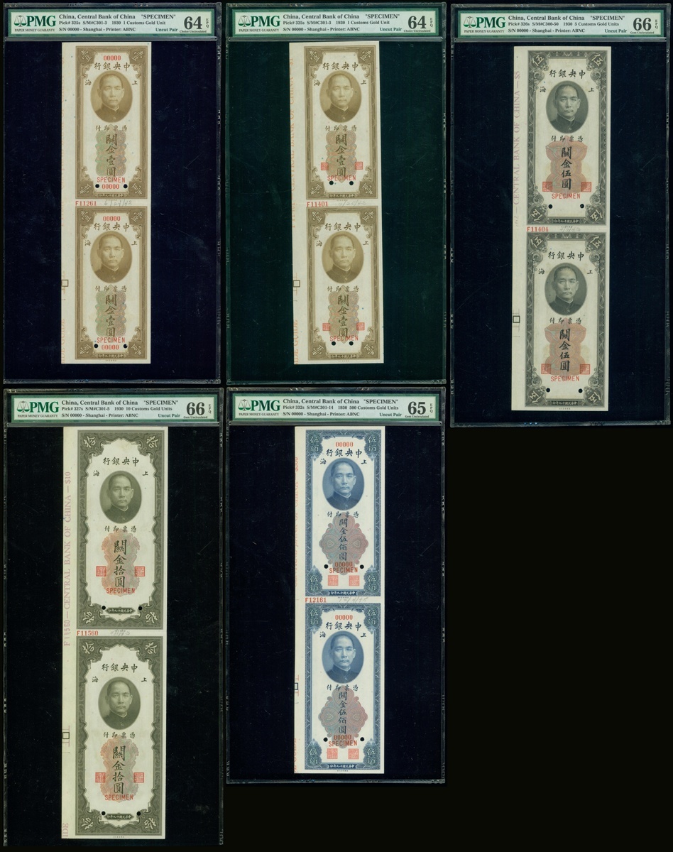 Central Bank of China, 1 (2 pairs), 5, 10, 500 Customs Gold Units, serial numbers 000000, specimen, 5 uncut pairs of 2, (Pick 325s, 326s, 327s, 332s), PMG64EPQ-PMG66EPQ, Choice Uncirculated to Gem Uncirculated (5)