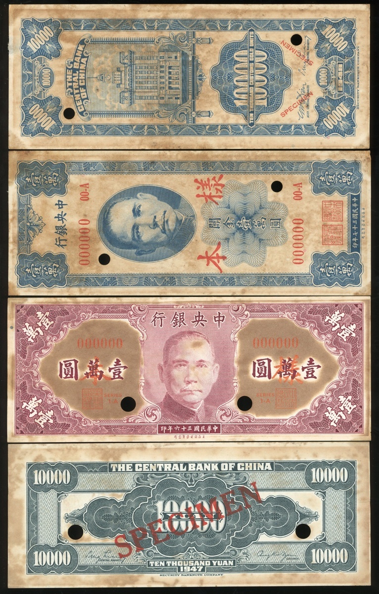民國三十六年中央銀行壹萬圓,三十七年關金壹萬圓正反面試印樣票一組兩枚,有嚴重黃斑,均GEF-AU