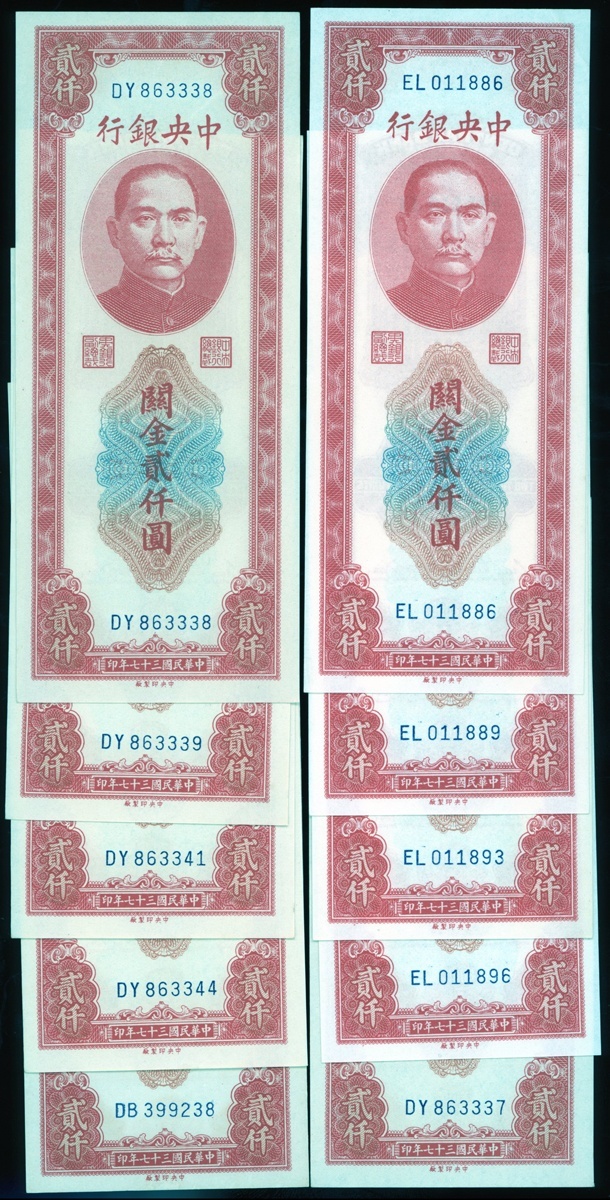 民國三十七年中央銀行關金貳仟圓一組十枚,有部分連號,均AU-UNC
