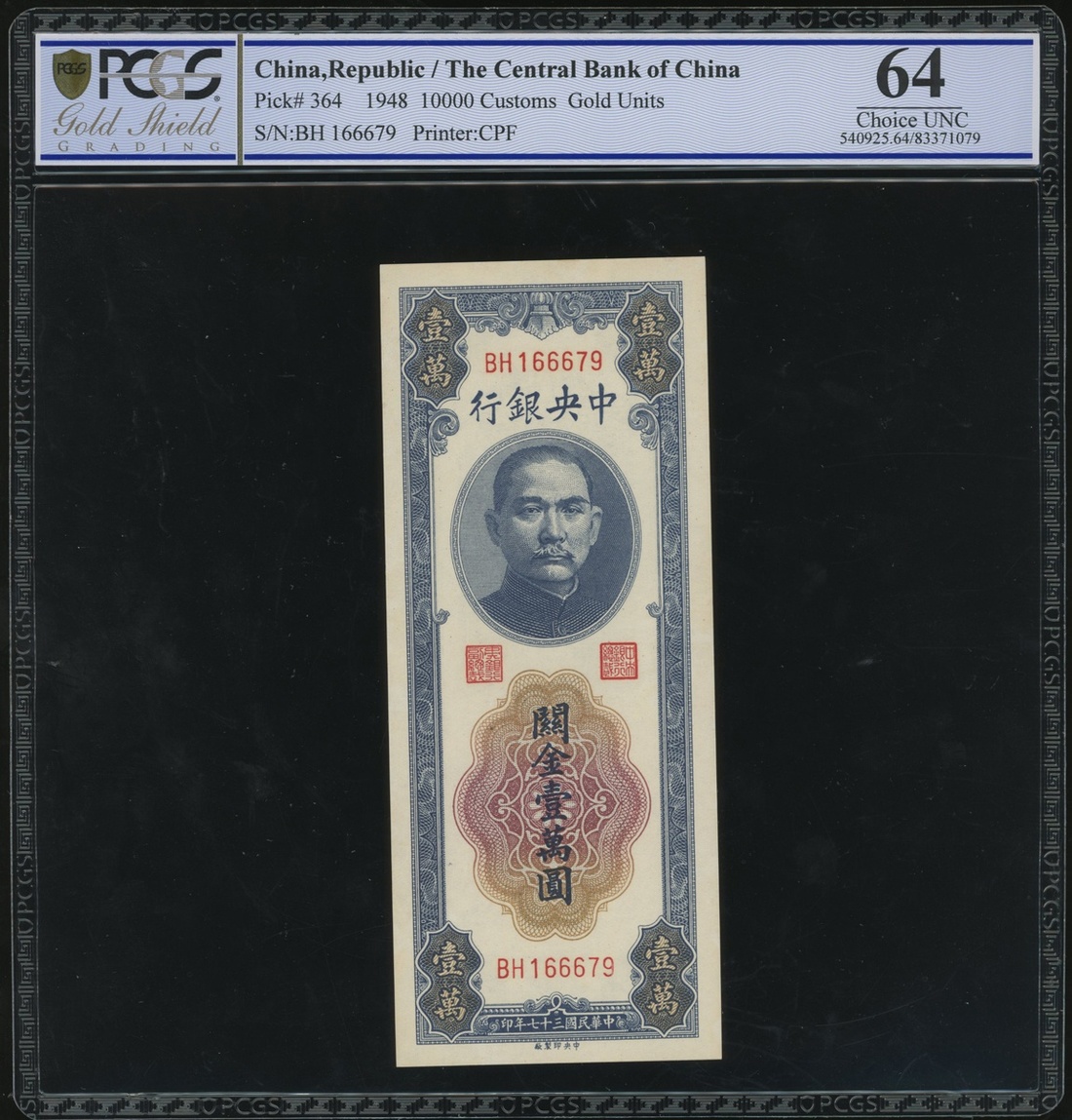 Central Bank of China, 10,000 Customs Gold Units, 1948, serial number BH166679, (Pick 364), PMG Gold Shield 64 Choice Uncirculated