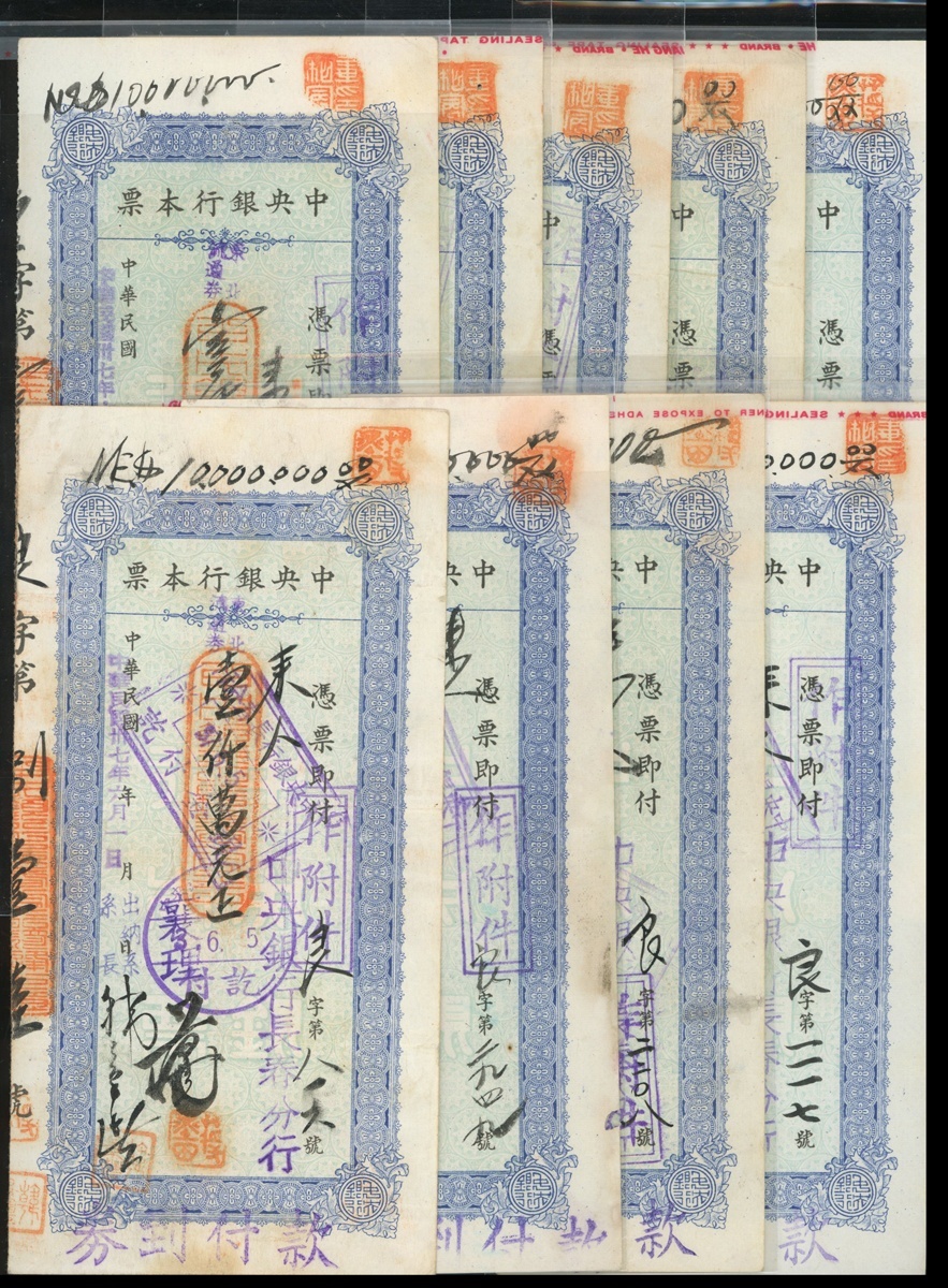 Central Bank of China, Changchun branch, a lot of 9 promissory note of 10 million, 1948, 3 different signatures,