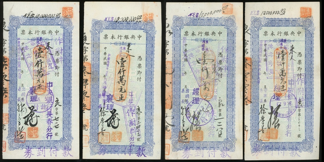 1948年中央銀行長春分行本票4枚一組,面額每張1千萬元,四種不同簽名,VF品相