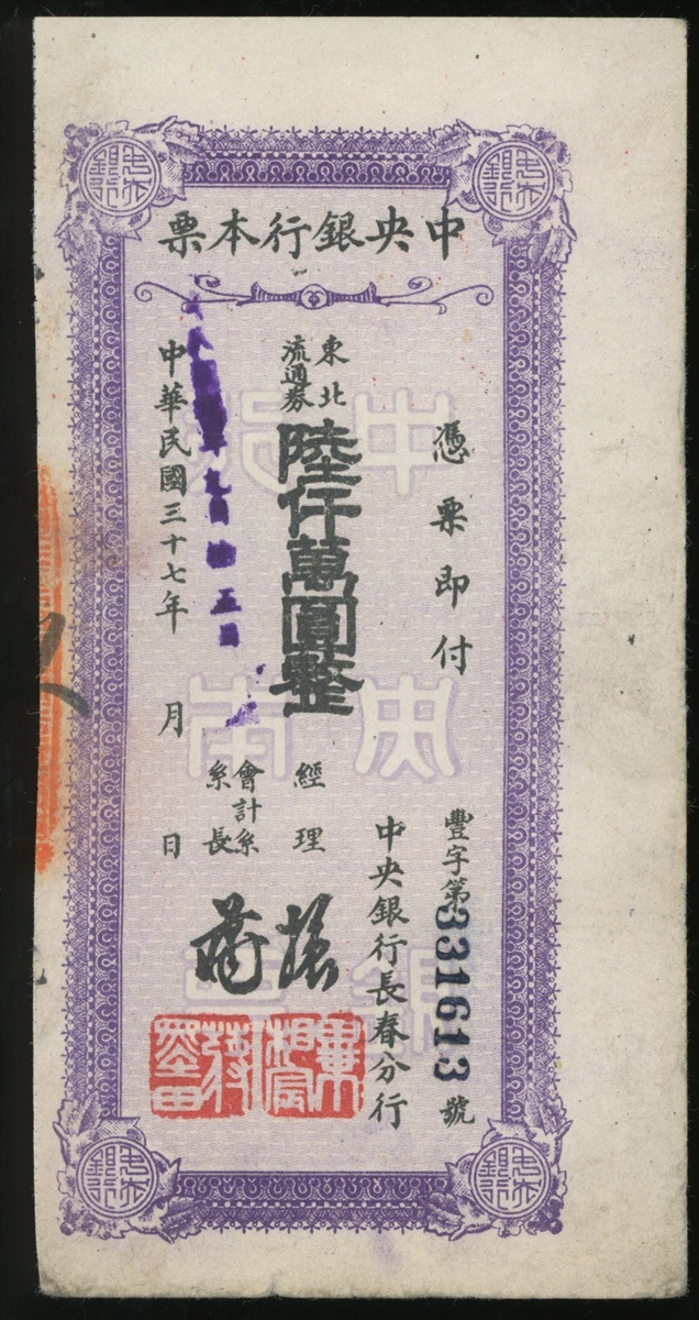 Central Bank of China, Changchun branch, promissory note of 60 million, 1948, number 331613, (Pick unlisted), good fine and rare seen.