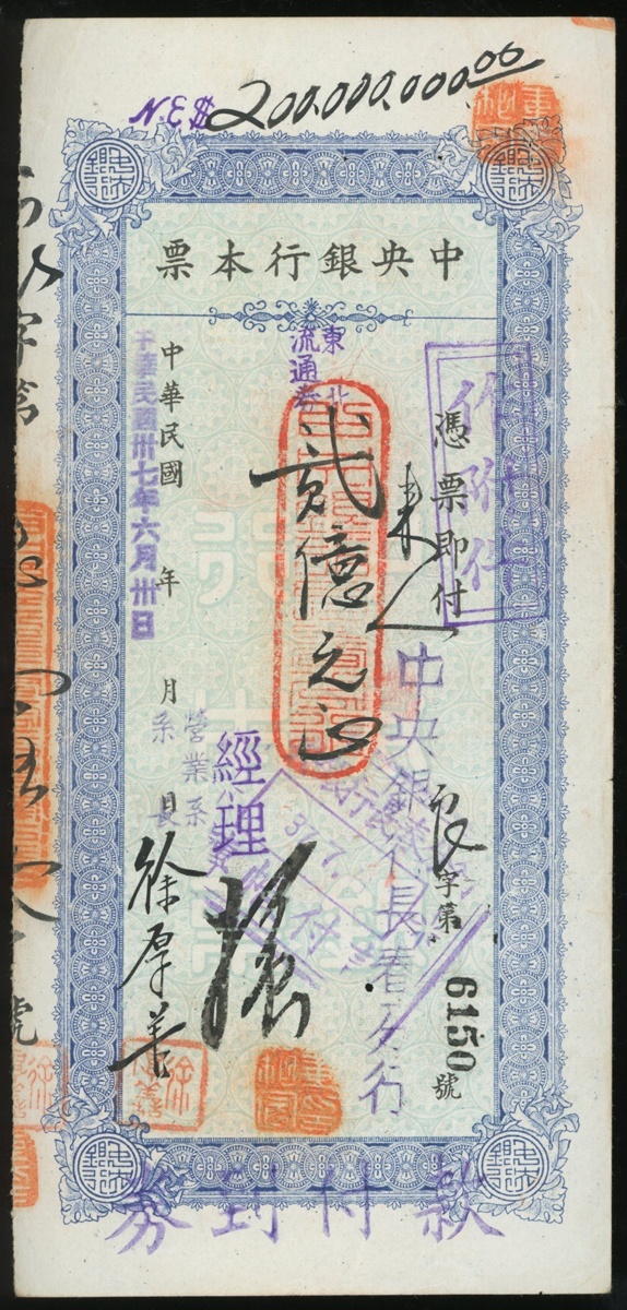 Central Bank of China, Changchun branch, promissory note of 200 million, 1948, number 6150, (Pick unlisted), very fine and rare seen.