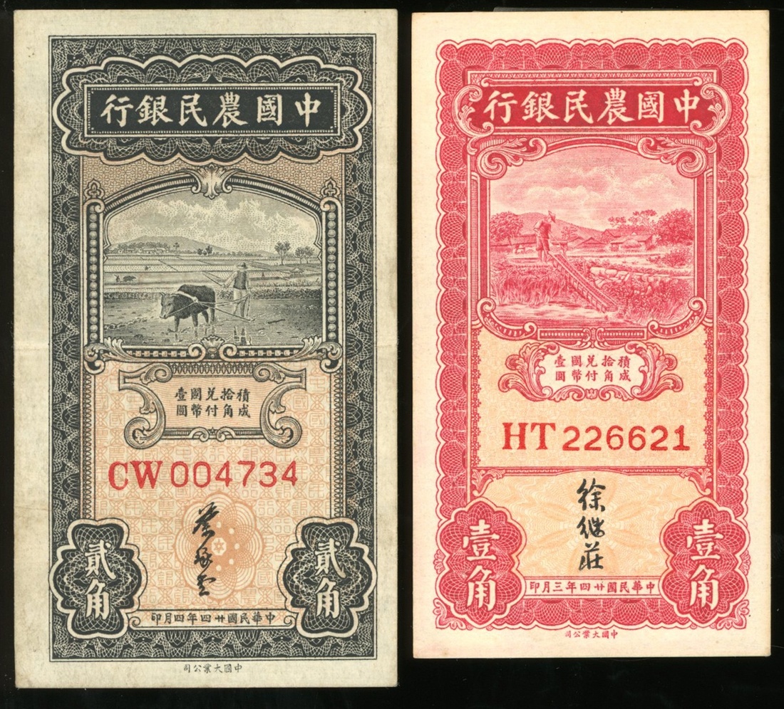 The Farmers Bank of China, 10 cents and 20 cents, 1935, serial number CW004734 and HT226621, small vertical format,