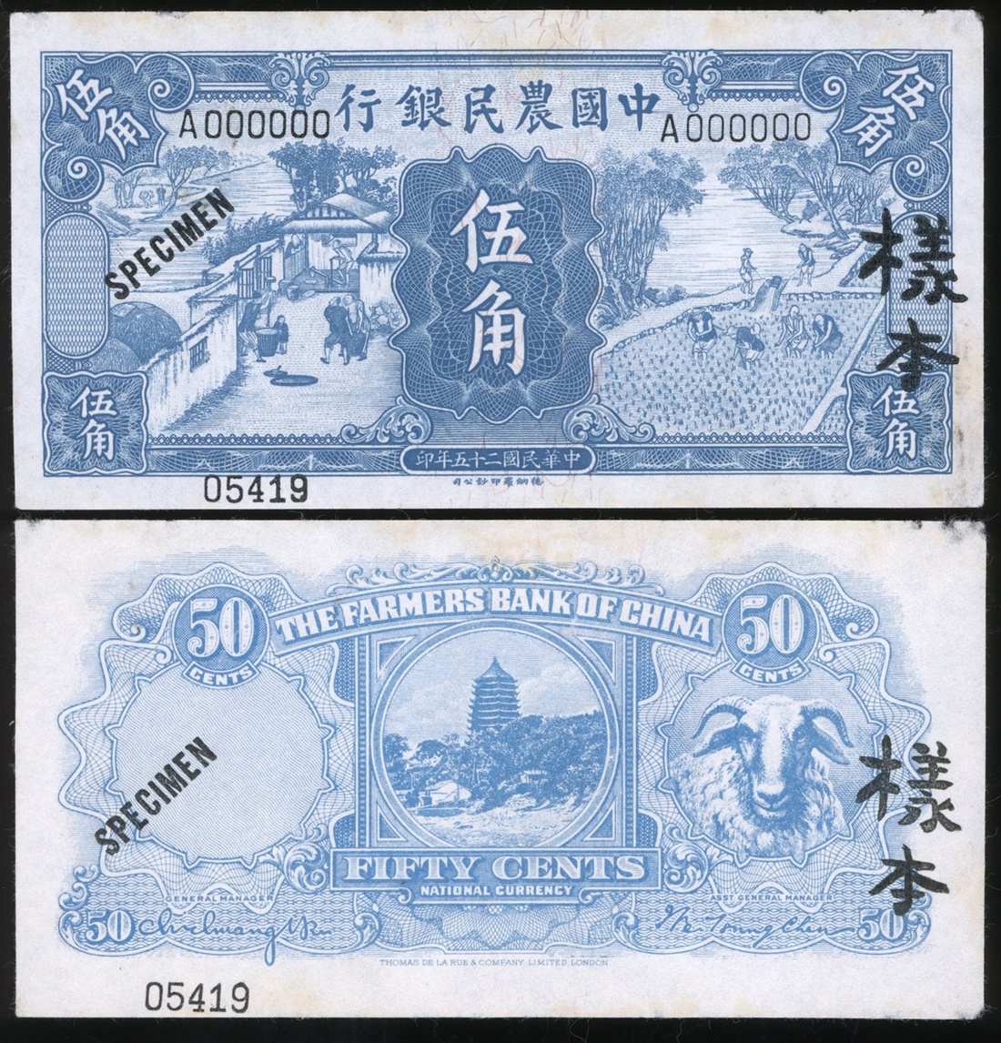 Farmers Bank of China, 50 Cents, obverse and reverse specimens, 1936, serial number A000000, (Pick 460s), foxing, good extremely fine (1 pair)