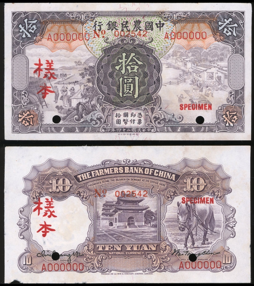 Farmers Bank of China, 10 Yuan, obverse and reverse specimens, 1935, serial number A000000, obverse and reverse specimens, control number 002542,