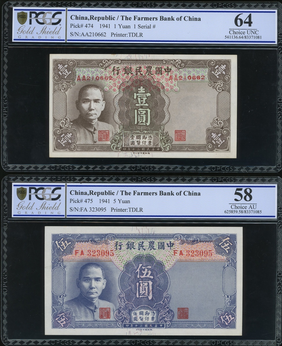 Farmers Bank of China, 1 & 5 yuan, 1941, serial number AA210662 & FA323095 respectively, (Pick 474 & 475), PCGS Gold Shield Grading 58 and 64 respectively (2).