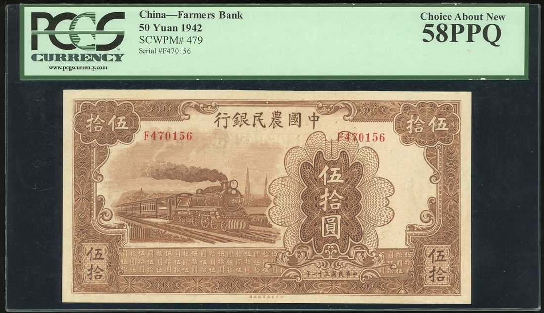Farmers Bank of China, 50 Yuan, 1942, serial number F470156, (Pick 479), PCGS Currency 58PPQ, Choice About New and difficult to find in this grade