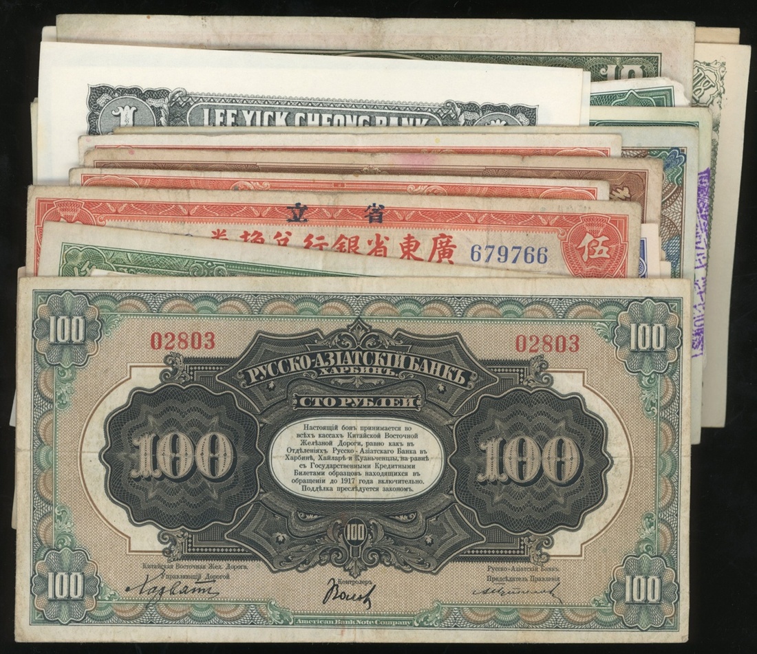 Republican era, a large lot of c.90 assorted banknotes, Hainan Bank, Kwangtung Provincial Bank and others, also included are a few bonds from Kwangtung Province, of note there is a Russo Asiatic Bank 100 roubles, 1917, Market Stabilisation Bureau 50 coppers, 1915, etc,