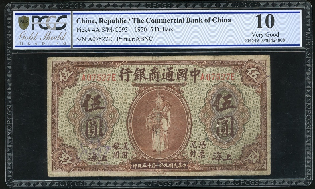 Commercial Bank of China, $5, Shanghai, 1920, serial number A07527E, (Pick 4A), PCGS Gold Shield Grading 10, Very Good