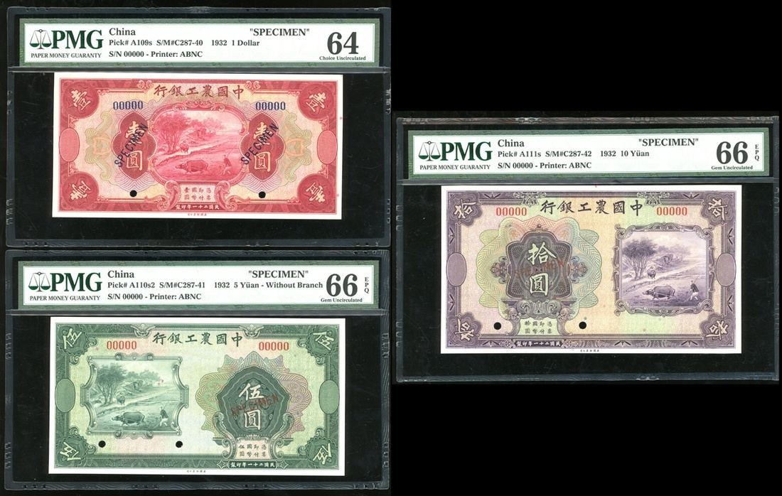 Agricultural and Industrial Bank of China, 1, 5, 10 Yuan, 1932, serial numbers 00000, specimens, (Pick A109s, A110s2, A111s), PMG64-PMG66EPQ, Choice Uncirculated to Gem Uncirculated (3)