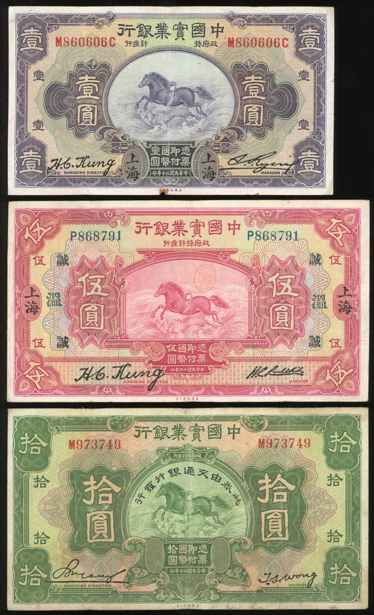 The National Industrial Bank of China, 1 and 5 yuan, Shanghai, 1931 and 1924 respectively, serial numbers M860606C and P868791, also Bank of Communications, 10 yuan, overprinted on the National Industrial Bank of China, serial number M973749,