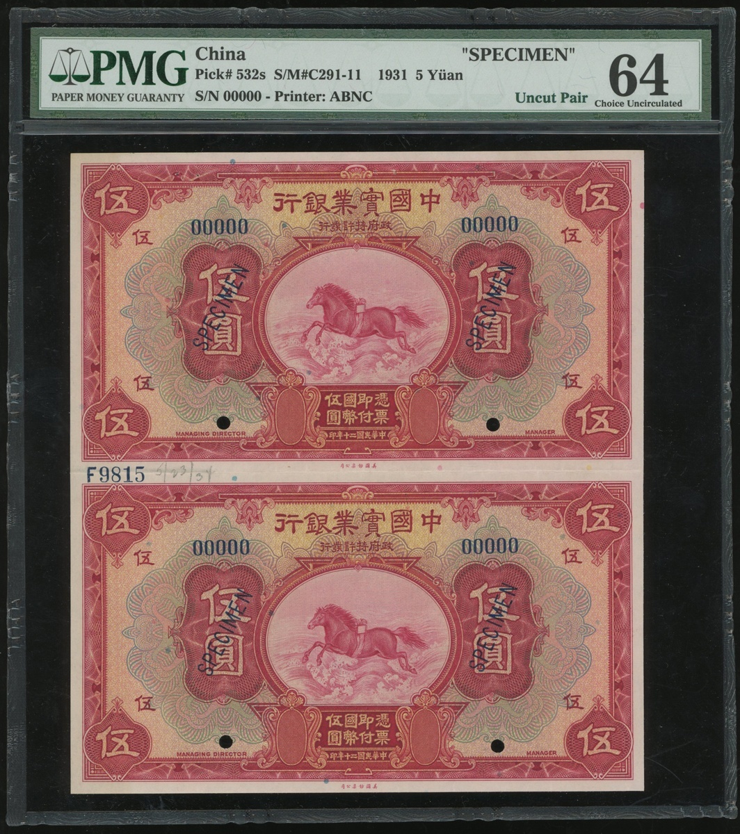National Industrial Bank of China, $5, 1931, serial numbers 00000, specimen, an uncut pair of 2, (Pick 532s), PMG64, Choice Uncirculated