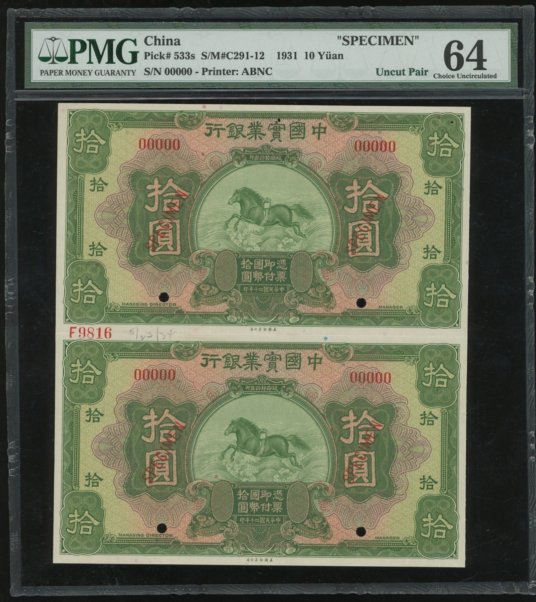 National Industrial Bank of China, $10, 1931, serial numbers 00000, specimen, an uncut pair of 2, (Pick 533s), PMG64, Choice Uncirculated