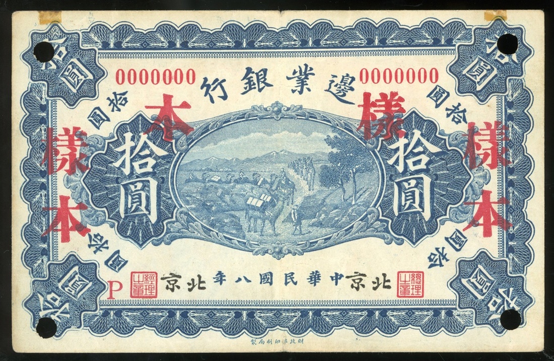 1919年邊業銀行10元樣鈔,北京地名,GVF品相