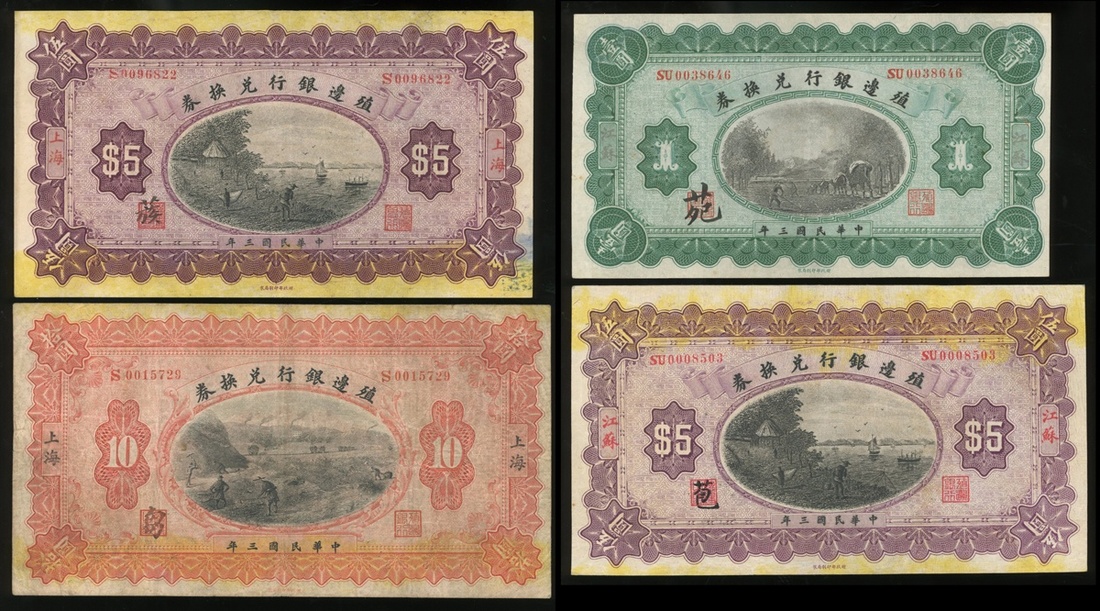 The Bank of Territorial Development, a set of $1, 2 x $5 and $10, 1914, serial number SU0038646, SU0096822, SU0008503 and S0015729, with 'Kiangsu' and 'Shanghai' place name and Chinese characters overprinted,