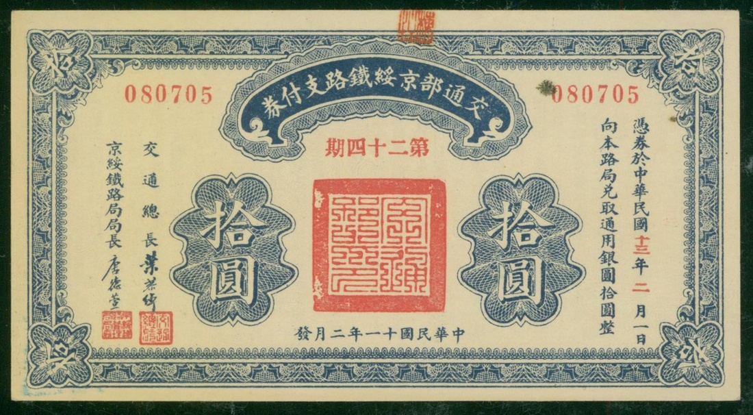 民國十一年交通部京漢鐵路支付劵拾圓,AU