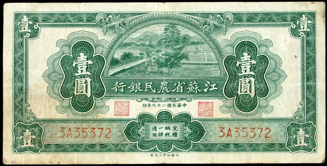 Kiangsu Farmers' Bank, 1 yuan, 1940, serial number 3A35372, (Pick S1202), good fine