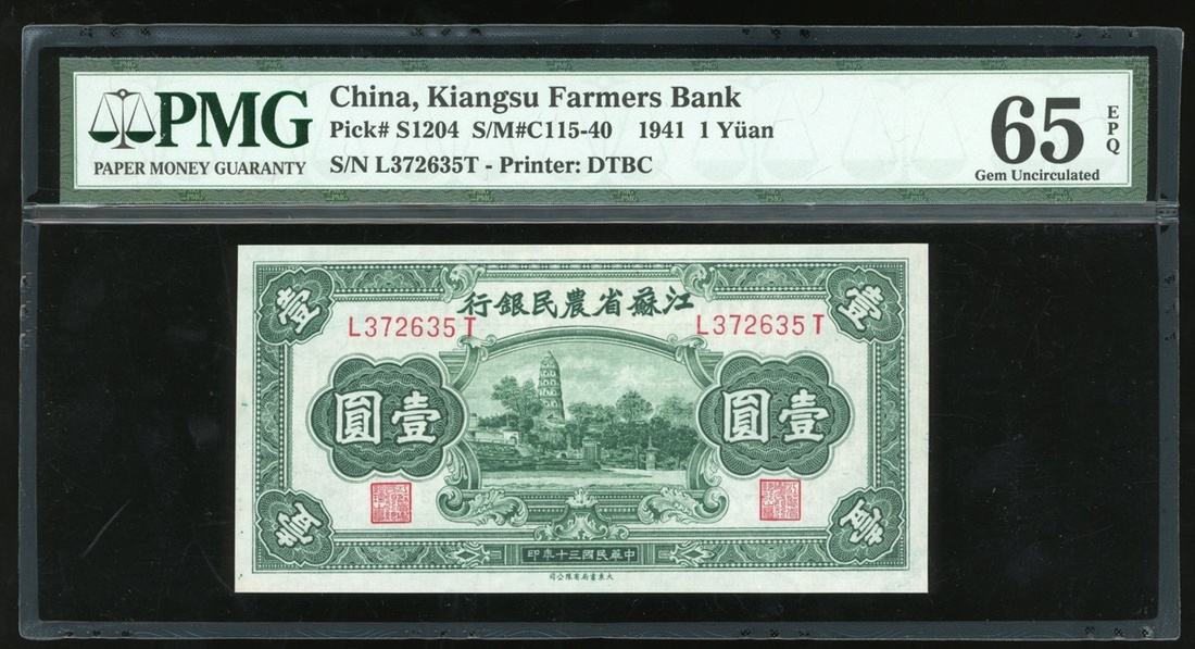 Kiangsu Farmers Bank, 1 yuan, 1941, serial number L372635T (Pick S1204), PMG 65EPQ Gem Uncirculated.