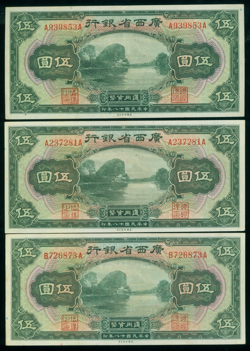 民國十八年廣西省銀行伍圓一組三枚,均EF