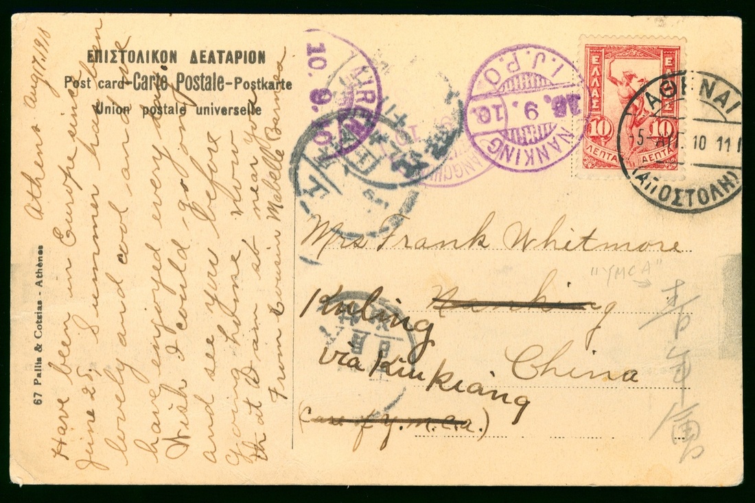 1910 (7 Aug.) a picture postcard from Greece to Nanking redirected Kuling.