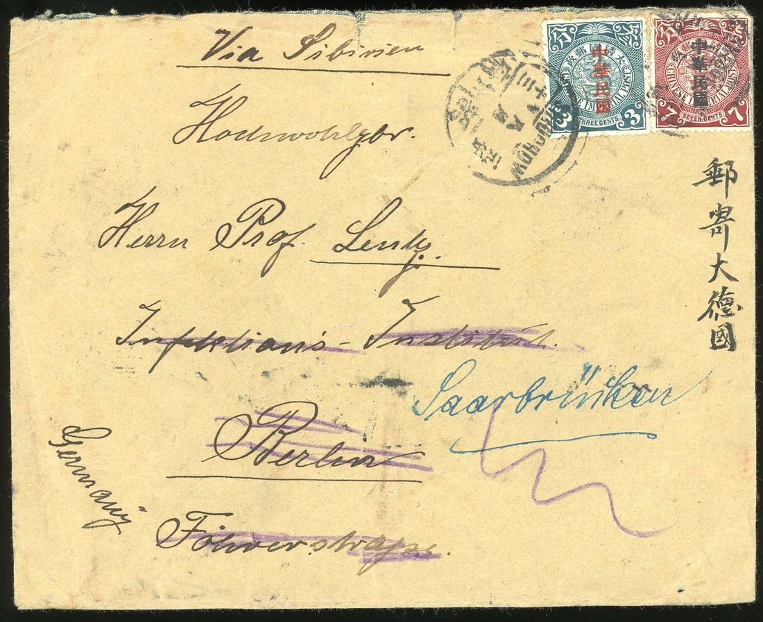 1912 (13 Aug.) a cover to Germany bearing 3c. and 7c. tied by Shiuchow c.d.s., on reverse unclear red Shiuchow Postal Agency chop.