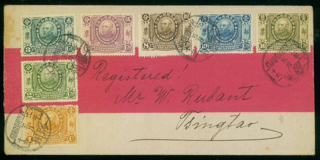 1913 (16 May.) red band cover to Tsingtau bearing Republic Commemorative Issue 1c, 2c, 3c, 5c, 8c, 10c, 16c tied by Kiaochow c.d.s., 8c with shift perf. variety.