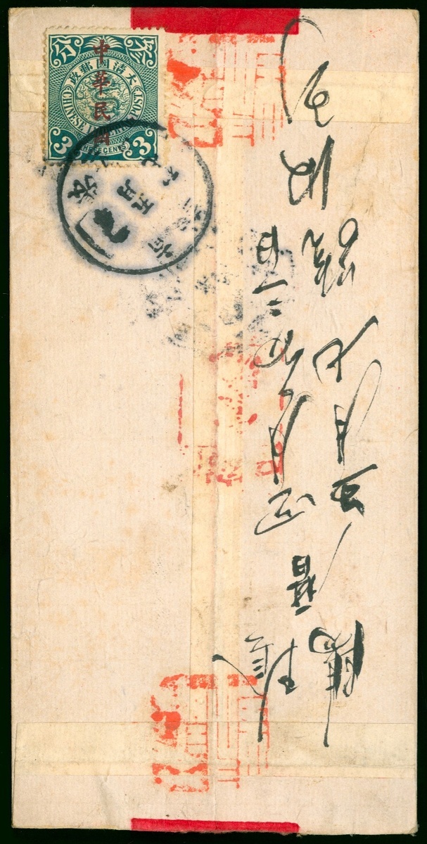 1913 (11 Jun.) red band cover to Peking bearing C.I.P. coiling dragon Waterlow and Sons ovpt. 3c tied by Changkiakow c.d.s. with Changkiakow tombstone post box cachet in red, fine.