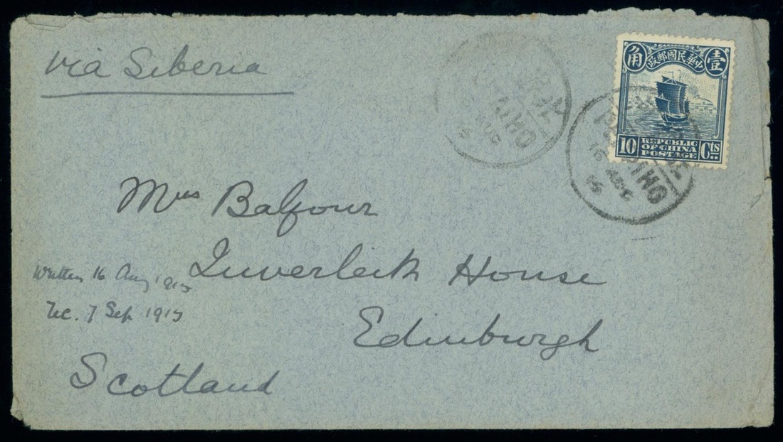 1915 (16 Aug.) envelope to Scotland, bearing First Peking Print Junk 10c, tied by Peitaiho c.d.s, on the reverse, with Peking-Moukden train post office c.d.s.