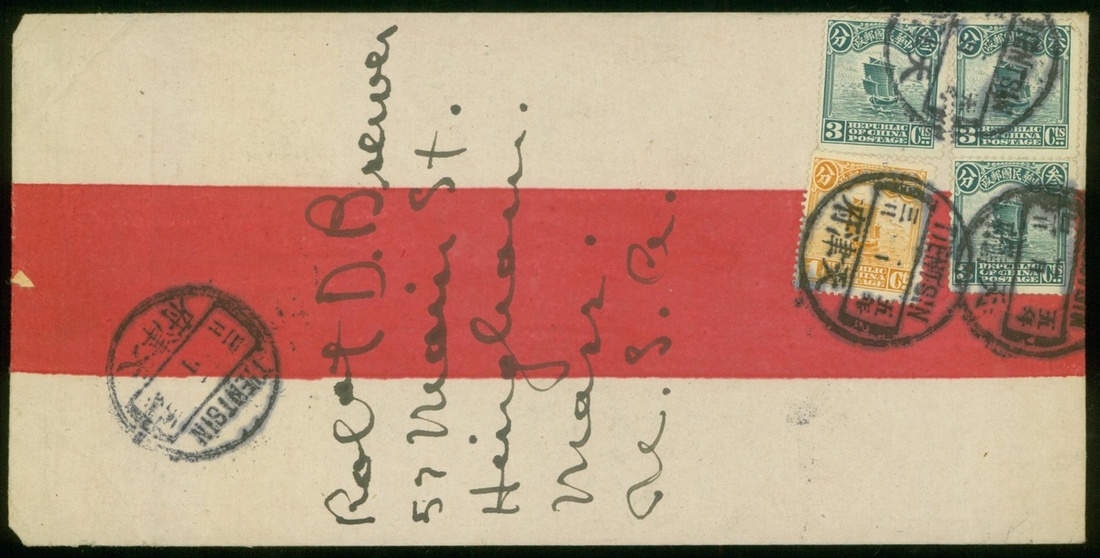 1916 (3 Jan.) red band cover to U.S.A. bearing Junk1c, 3c (3) tied by Tientsin bilingual c.d.s., cover sent in early Hung Hsien Empire.