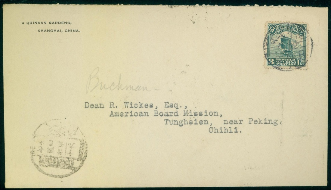 1918 envelope from Shanghai to Peking, bearing Junk 3c tied by "Shanghai-Nanking train P.O. SNR" round h.s. with Tientsin transit c.d.s. (25.4) and Peking arrival, fine.