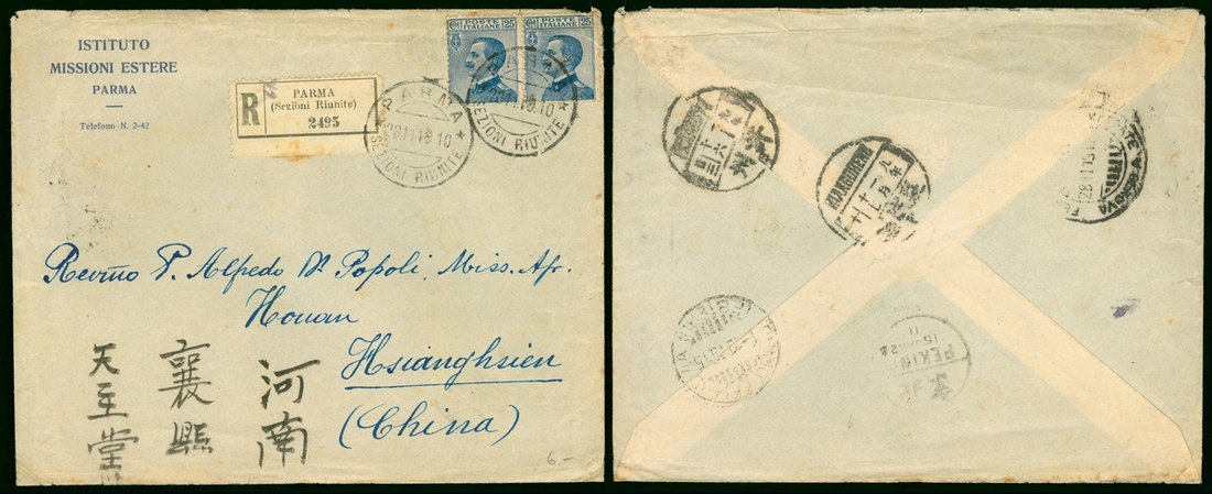 1919 (28 Nov.) Italy to Hiangcheng, Honan registered cover, bearing Italy 25c. (2), tied by Parma c.d.s., on the reverse with Italy, Peking, Suchow transit and 17 Jan. Hiangcheng arrival bilingual c.d.s. beside.