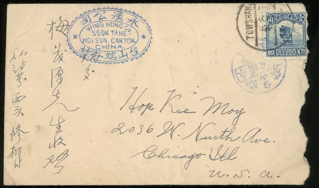 1924 (30 Jun.) a cover to U.S.A. bearing Junk 10c. tied by Wing Hong Co. postal agent blue chop and Towshan c.d.s., poor condition.