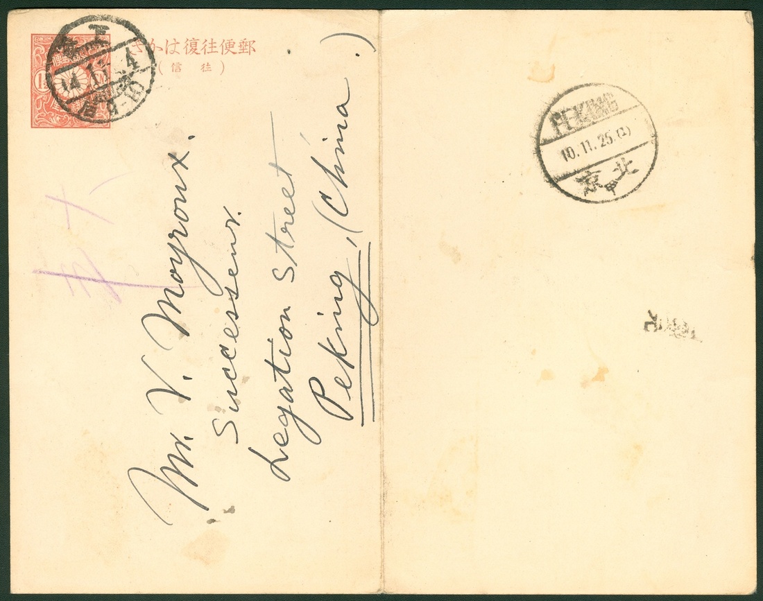 1925 (4 Nov.) 1 1/2s reply card from Japan to Peking tied by Japan c.d.s. with Peking arrival (10.11).