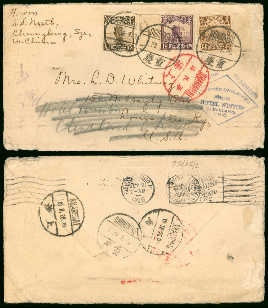 1926 (29 Jul.) envelope to U.S.A bearing Junk 1 1/2c and 13c tied by Chungking c.d.s., transit via Shanghai (8.8) and U.S.A. arrival in Aug. The postmark "Return to Sender" indicate the addressee is unknown at the address and this letter need to return, via Ohio (2.9) then to Shanghai (19.10), finally cancelled by Shanghai datestamp in red as unclaimed letter, fine and scarce.
