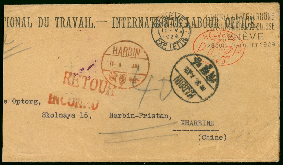 1929 (16 May.) envelope to Harbin bearing 7 1/2p postage and Geneve Exp. Letter machine postmark alongside, Harbin arrival (23.5), further Harbin c.d.s. (27.5), (9.7) in purple and (31.7) in red showing unknown addressee after several attepmt and "RETOUR" h.s. in red, clear postal route, fine.