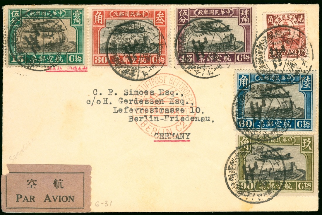 1931 (31 May.) envelope to Berlin, bearing complete set of 1921 airmail issue, Junk 2nd Peking Print 20c tied by Shanghai commemorative cachet postmarks, Berline luftpost h.s. in red on the address, Berlin arrival (11.6) on reverse.