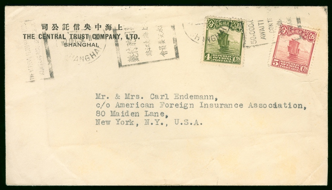 1931 (7 Dec.) Shanghai to U.S.A. cover, bearing Junk 4c.and 5c., tied by Shanghai "Relief Flood" machine postmark. This postmark is rare for cancellation.