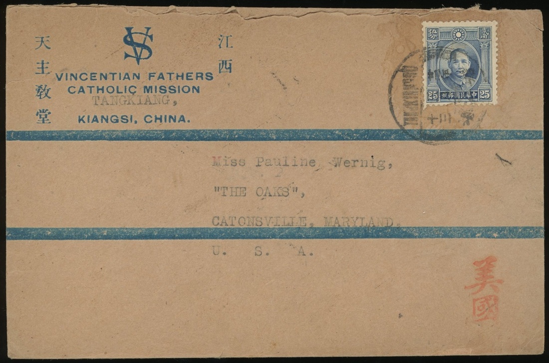 1933 (13 Mar.) envelope to USA, bearing Dr S.Y.S. London First Print 25c tied by Tangkiangsu c.d.s., on the reverse, with Namyung (15.3), Punyu (19.3) transit c.d.s., clear postal route, fine cover. Unusual outgoing mail sent from Kiangsi via Namyung transit.